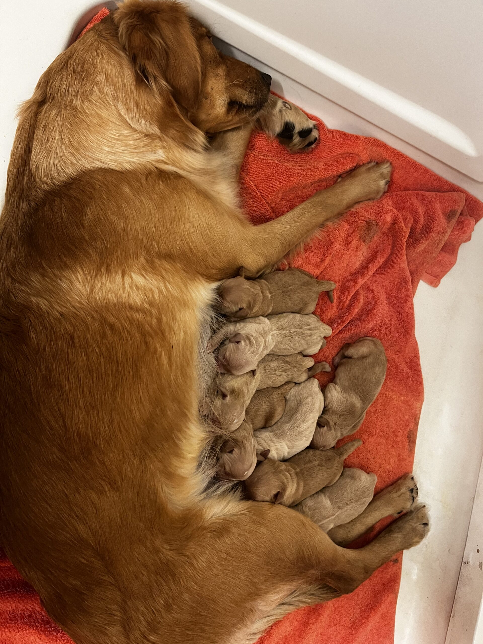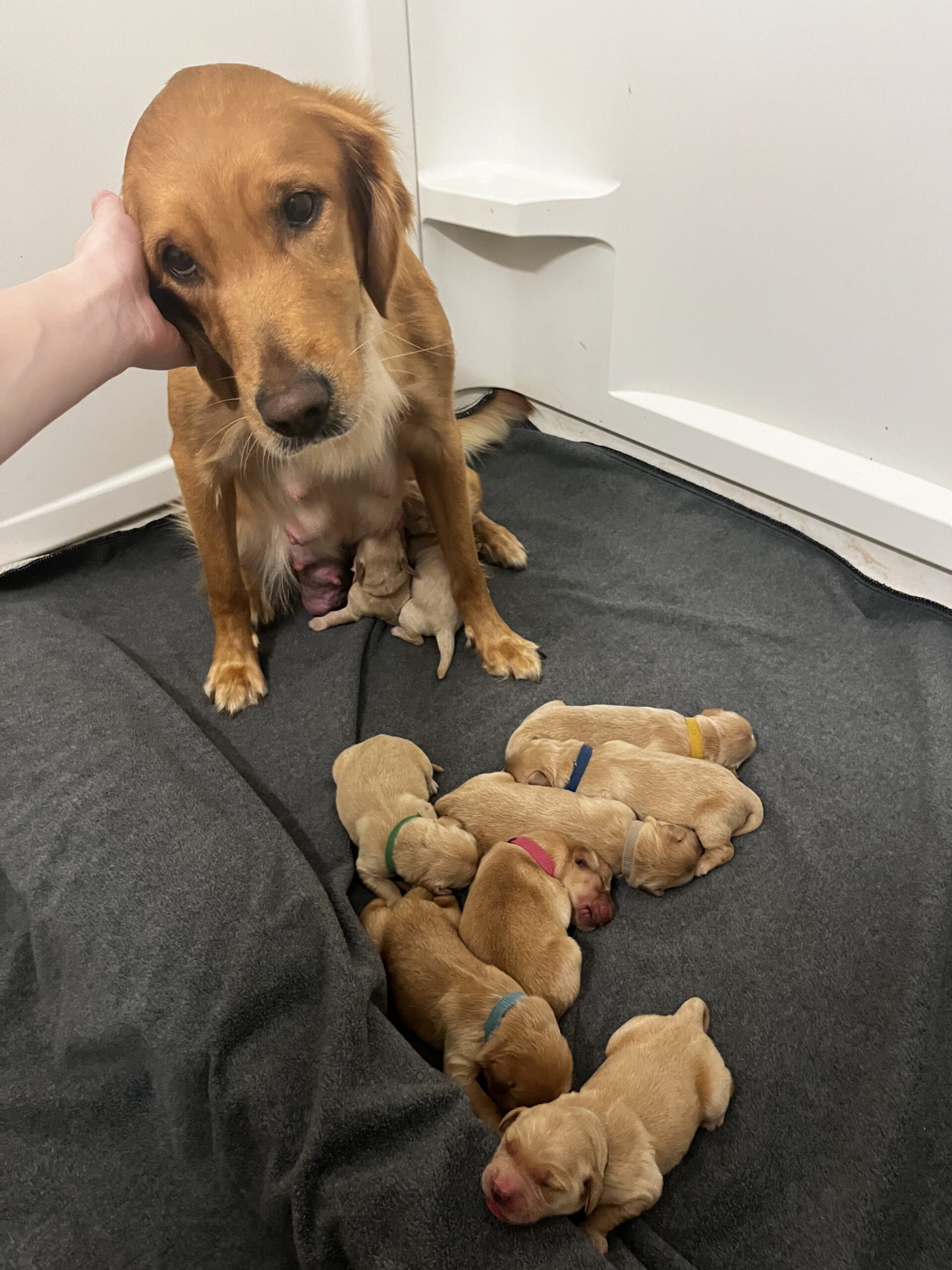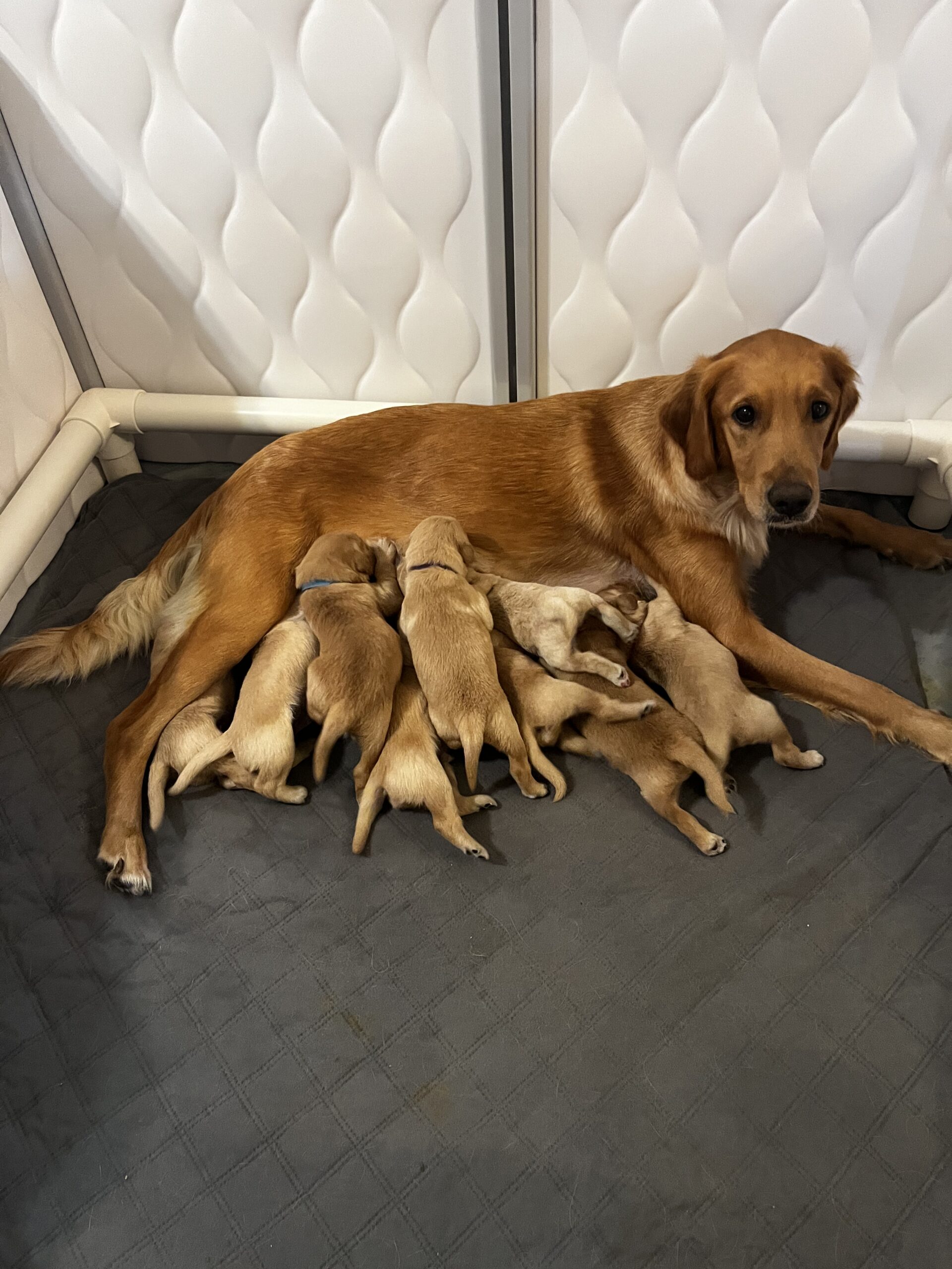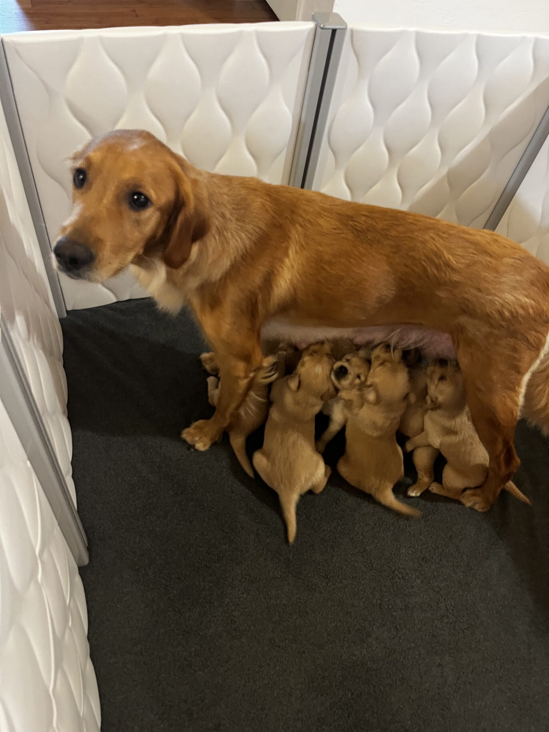 She is AKC-registered and DNA-tested, giving confidence in her health and pedigree. Her friendly temperament, intelligence, and nurturing nature make her an outstanding mother, raising puppies who grow up to be confident, affectionate, and well-socialized companions.